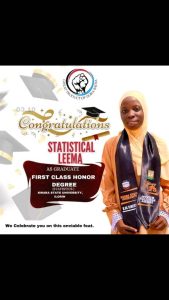 Growing up in a society where age-long social constructs often triumph ambitions, Ayyub Haleemat Abake, a resident of Badia-ijora Lagos State, stood her ground against the odds to preserve her future—therefore bagging First-class honour in Statistics at Kawara State University, Malete (KWASU)